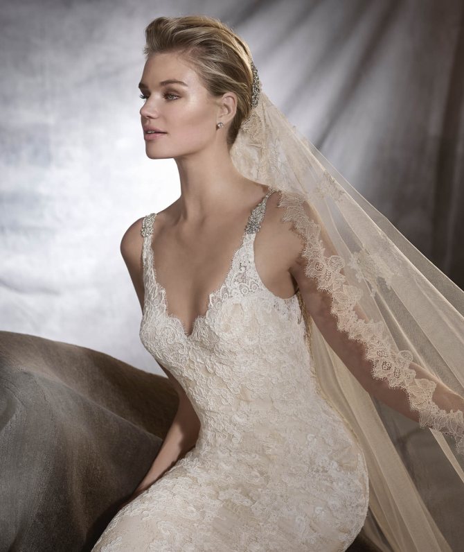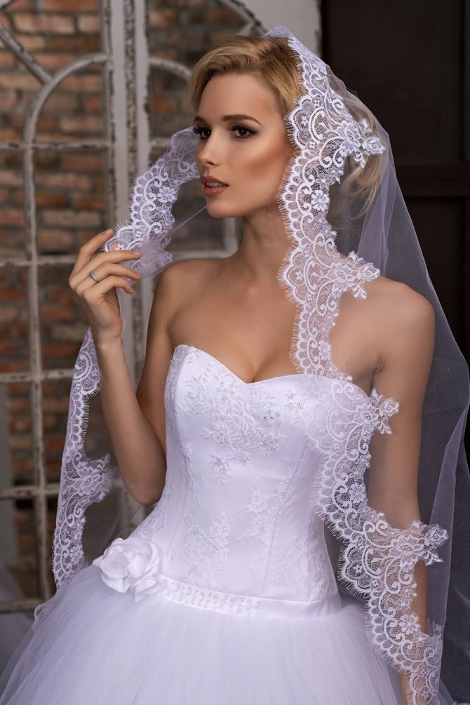 С фатой на лицо будут смотреться все фасоны платьев, будь то корсет, короткая модель или пышная.