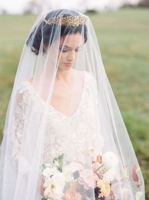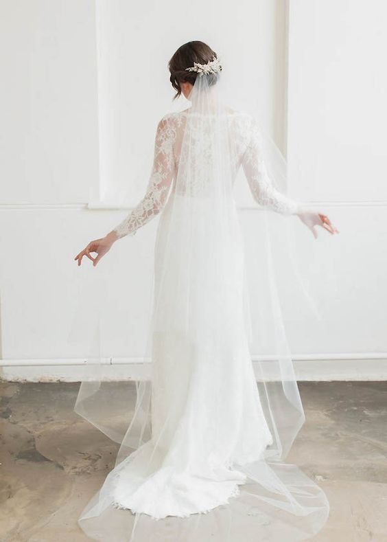 Тоже вариант фаты, который станет ключевым элементом образа и должен в нем солировать. Это длинная фата, заменяющая шлейф платья