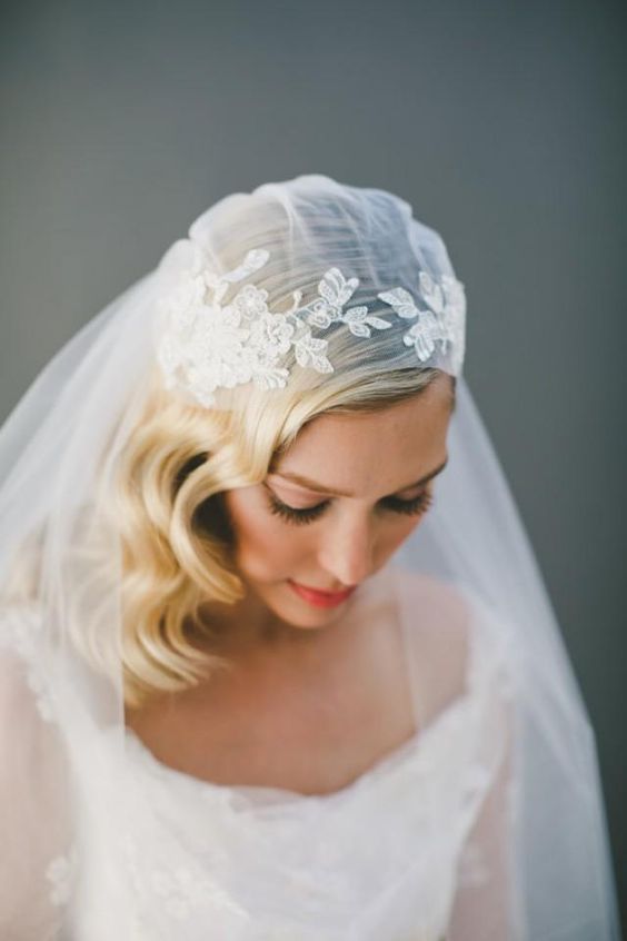Такой вариант был популярен в начале прошлого века. Фата-вуаль, прикрывающая часть лица, делает образ более загадочным. Выбирать такую стоит, если у вас платье в винтажном стиле, современный свадебный комбинезон или платье мини.