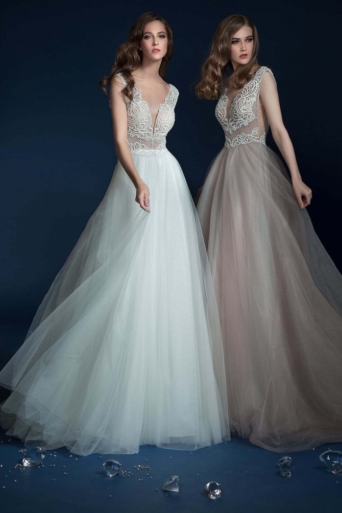 Глубокий вырез треугольной формы визуально вытягивает силуэт и акцентирует внимание на зоне декольте, а еще это один из главных трендов предстоящего сезона. Платья облегающего силуэта с длинным шлейфом из гладкого материала формируют женственные силуэты, в то время как пышные модели с драпировкой из кружева и фатина – нежные и воздушные образы.