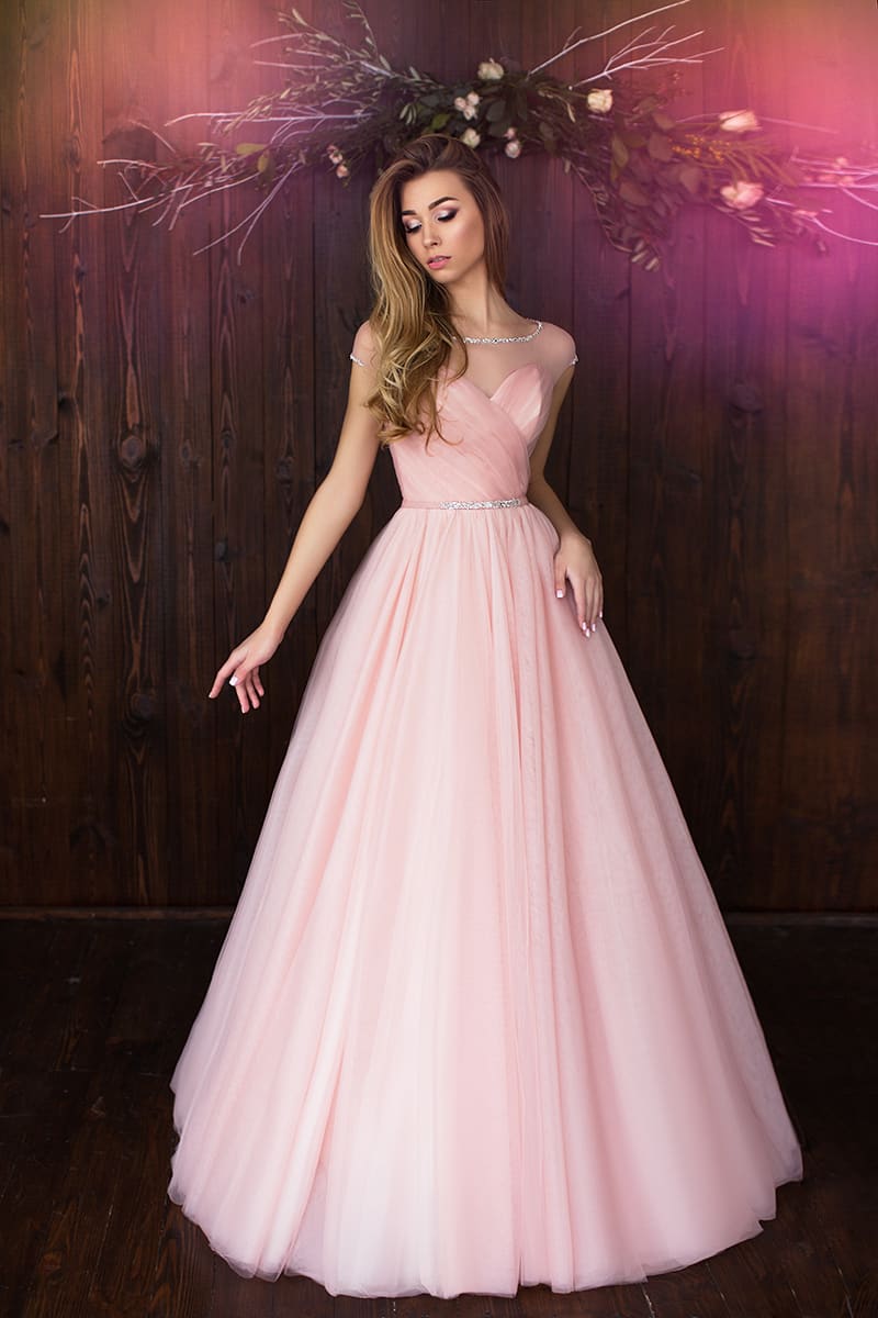 Еще один популярный оттеночный вариант – легкий розовый беж, очень похожий на нюдовый цвет. Он может сливаться с кожей, создавая иллюзию выреза, может быть расшит какими-то украшениями. Обычно платье не целиком этого цвета, а только его детали.