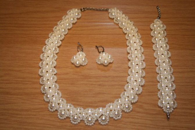 Подбирая свадебные украшения из белого бисера для невесты, рекомендуется сразу приобретать комплект – серьги, колье. Красота воздушного ожерелья завораживает – это нить бусин, на конце которой небольшой крючок. Такие изделия очень элегантны и современны, а прозрачные бусины внешне похожи на благородные бриллианты. Однако невесте необходимо быть предельно внимательной и сильно не перестараться, иначе она рискует стать похожей на яркую новогоднюю елку.