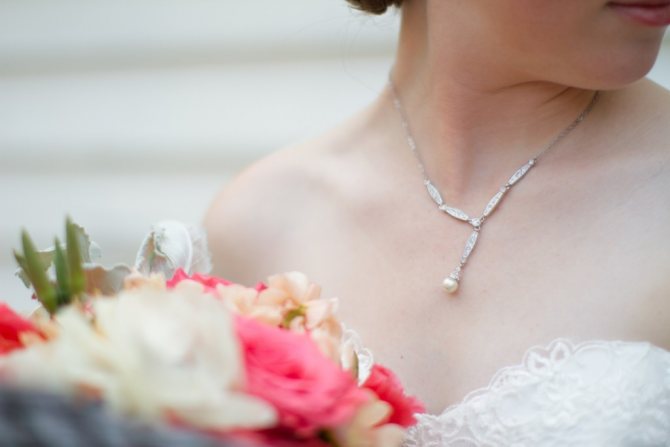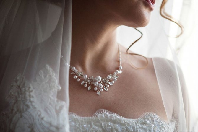 - Бижутерия на шею новобрачной должна подбираться с учетом фасона платья.