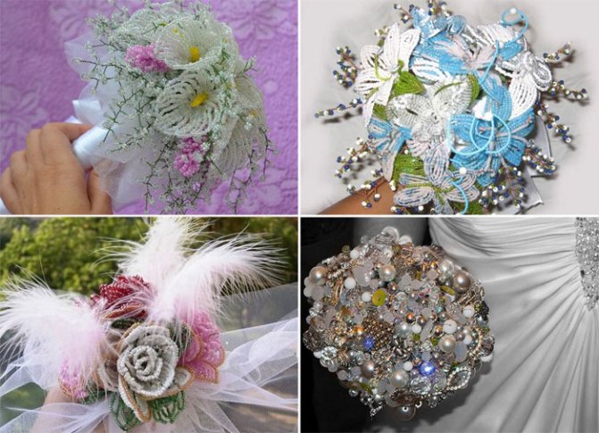 Свадебные украшения из бисера изысканные, нежные, современные. Букет, выполненный из этого материала, дополненный стеклярусом и стразами, выглядит очень красиво, оригинально и богато, идеально подходит практически под любой образ невесты. Достоинство такого аксессуара в том, что ему не страшен сильный ветер, дождь, он прекрасно переносит мороз и сохранит свою красоту даже к концу вечера. На протяжении длительного времени ваш букет не изменит свою правильную форму и будет долго напоминать о самом счастливом дне в жизни.