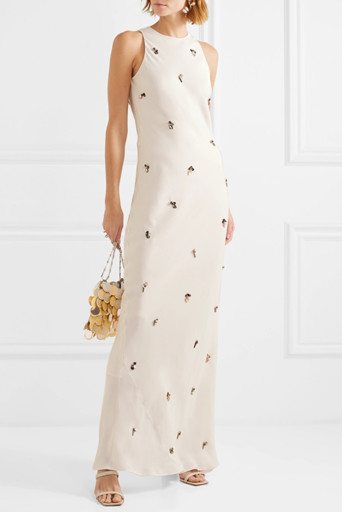 - Francesco Scognamiglio отдал предпочтение бежевому образу из шифона с длинными рукавами и однослойной юбкой с разрезом от бедра;