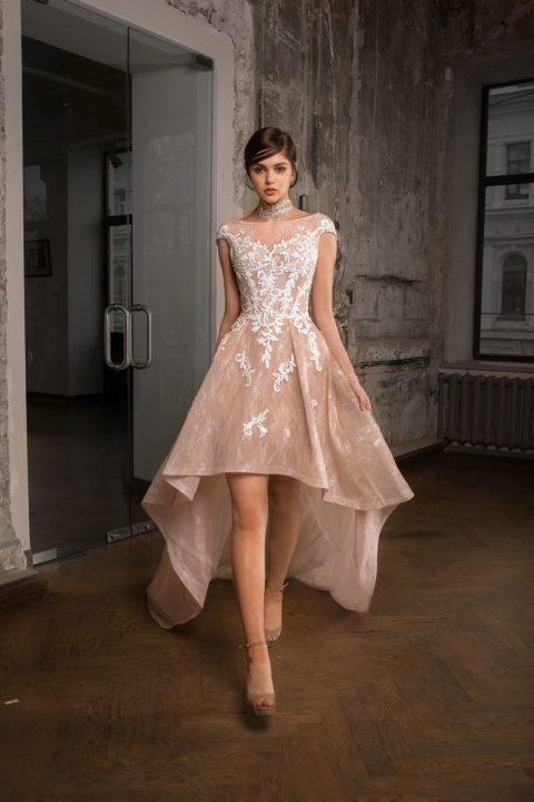 Фасон таких платьев отличается тем, что имеет спереди более короткую юбку, а сзади длинную, которая может переходить в шлейф разной длины. В некоторых моделях платьев, шлейфы могут быть съемными, что делает платье еще более удобным. Такой фасон платья отлично сможет подчеркнуть стройные ноги невесты, а также визуально сделать девушку выше.