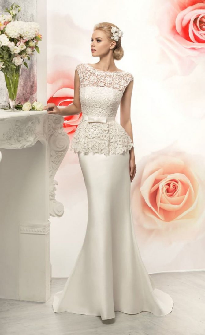 Бывает любой длины и украшается красивыми элементами, например, кружевом. Выбирая данную модель, девушка сможет подчеркнуть свою фигуру, открыть стройные ноги и показать всем свои нарядные свадебные туфли.