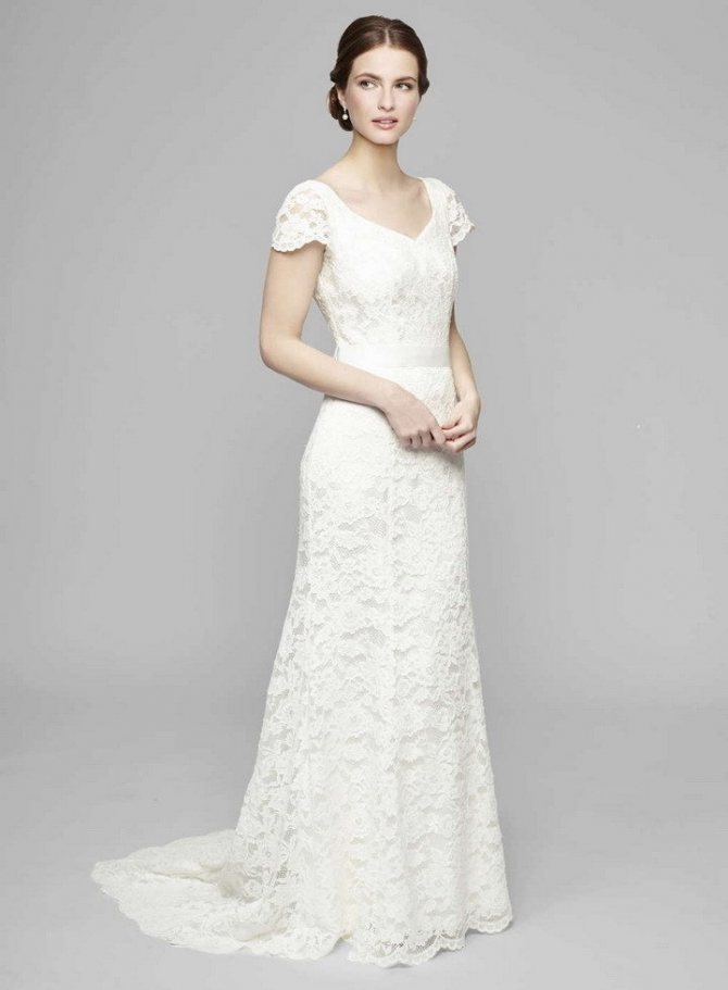 Ажурные платья прямого покроя – образец элегантности. Наиболее удачно они выглядят на стройных высоких девушках. Худеньким невестам невысокого роста при выборе подобного наряда нудно обязательно носить высокий каблук.