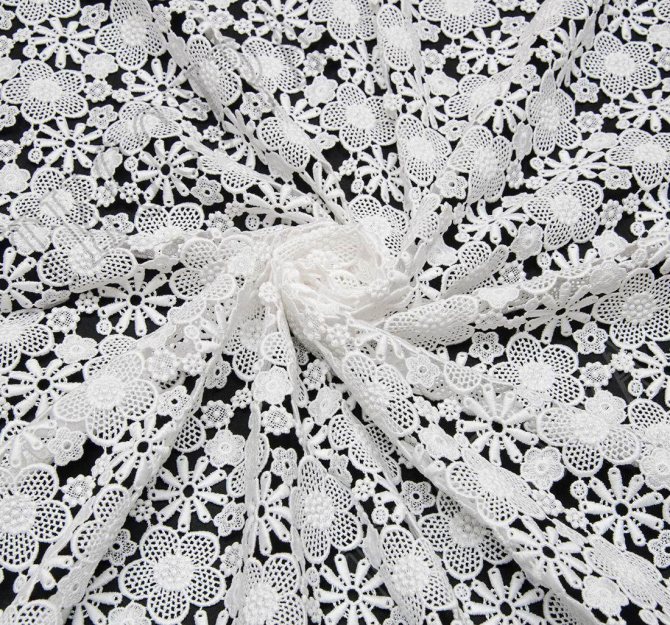 Гипюр – ткань, изготовленная с помощью сшивания ажурных элементов из нитей разной толщины. В основе – тонкая сетка, поверх которой лежит кружево. Из-за прозрачности этот материал используют в основном для декорирования юбки или лифа. Наряд из него лучше выбирать в теплое время года.