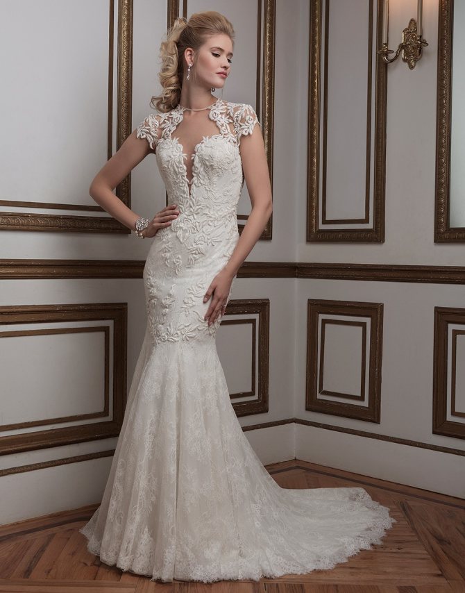 На обладательницах фигуры «песочные часы» и высоких стройных девушках эффектно выглядят наряды фасона русалка (рыбка) с кружевным шлейфом или гипюровыми вставками на корсете.