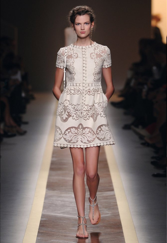 Valentino в предвкушении лета выбирает нюдовый пудровый тон. Средняя длина платьев позволяет подобрать модель большинству женщин, а отрезной приталенный крой формирует силуэт. Объемные рукава средней длины полуобнажают женские плечи, а разница в размере ажурного полотна позволяет использовать его без дополнительных аксессуаров.