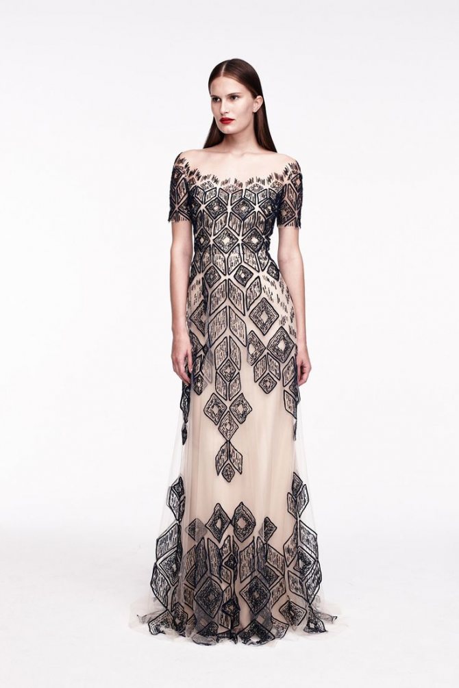 Винный цвет платья Marchesa вовсю демонстрирует женскую сексуальность. Обнаженные плечи, облегающий крой – все это открывает взгляду красоту женского тела. Кокетливые воланы на рукавах и подоле сглаживают агрессивность, создавая аромат легкой интриги.