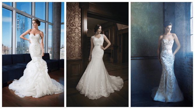 - Желателен высокий рост. «Рыбка» за счет сильного облегания визуально расширяет бедра, а заниженная талия укорачивает ноги. У невысокой невесты будут нарушены пропорции;