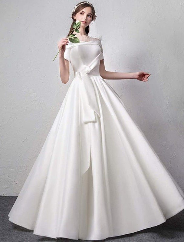 Шьют свадебный наряд из атласной ткани, которая в буквальном смысле струится по телу. При помощи плавно ниспадающих складок ткани можно удачно оттенить достоинства фигуры и скрыть ее недостатки.