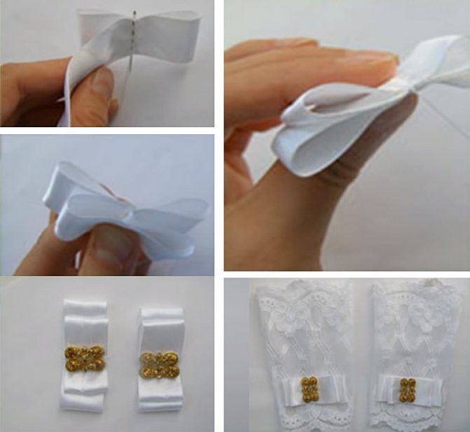 6. Декорируем с помощью атласных лент шириной 1-2 см (длина 20-25 см) 8. Украшаем бантик брошью и пришиваем к перчаткам Итог работы: