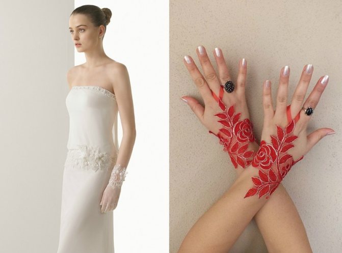 Для рукодельниц не проблема сделать необычную и красивую модель – шитую, вязаную, плетеную. Для тех, у кого мало опыта, но есть желание создать свадебные перчатки своими руками, можно посоветовать два варианта: