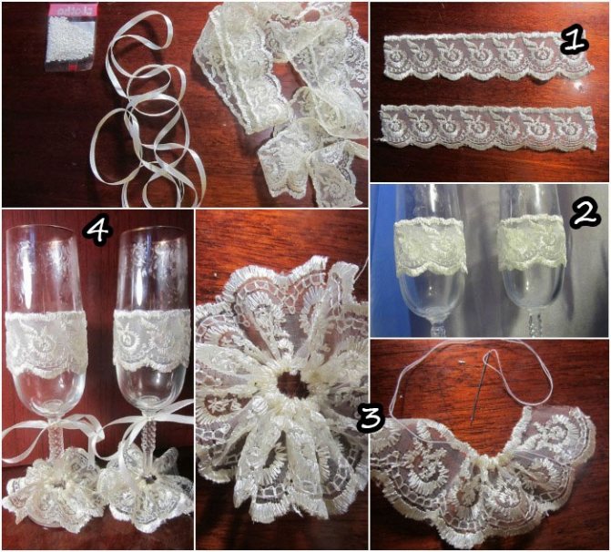 Если вам не нравится буквальное «одевание» свадебных бокалов, его можно заменить символическим оформлением. Например, довольно часто ограничиваются атласными лентами, кружевом двух цветов или отличными деталями. Кружево должно быть одного вида, чтобы сохранить стиль. Такая отделка проста в исполнении, но от этого её красота не уменьшается.
