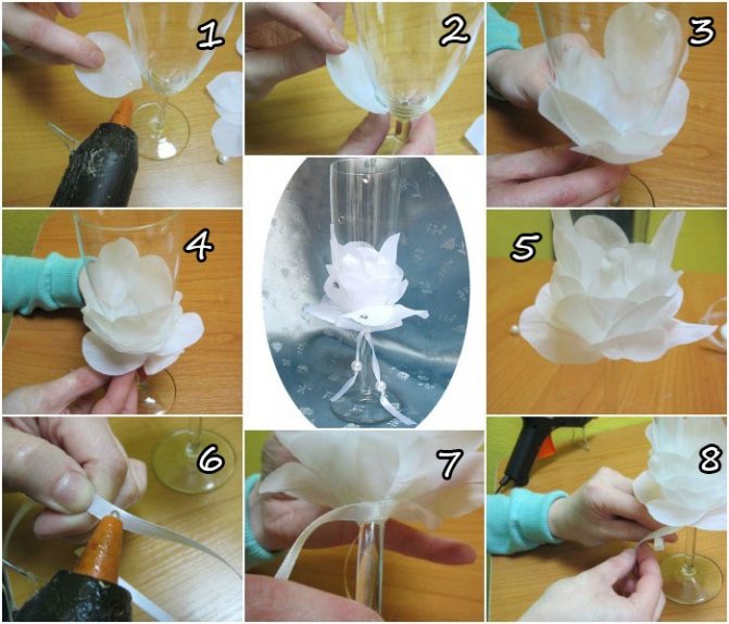 Также цветы могут быть сшиты из лент с серебряной или золотой каймой в технике канзаши. Нежные розы белого или розового цвета прекрасно смотрятся на прозрачном стекле бокалов. Свадебные бокалы из атласных лент станут самым главным аксессуаром красивой пары молодоженов.