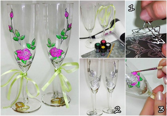 Главным украшением свадебных бокалов становится декор. Он изготавливается в заводских условиях (гравировка), его можно заказать в специализированной мастерской или сделать самостоятельно.