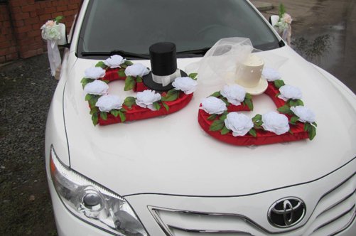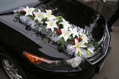- Цветы используют живые и искусственные. Практичнее будет вариант украшения с искусственными цветами. Отдельные цветки можно закрепить на зеркалах или ручках машины. Аккуратную композицию из цветов, располагают на правой стороне капота;