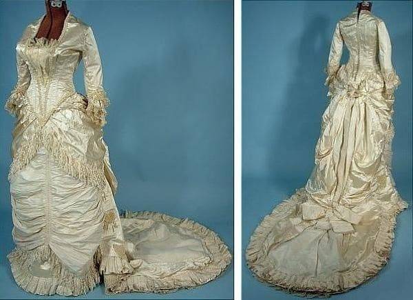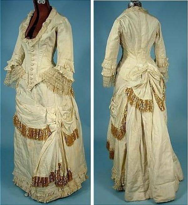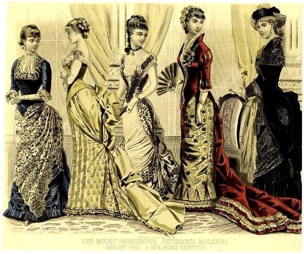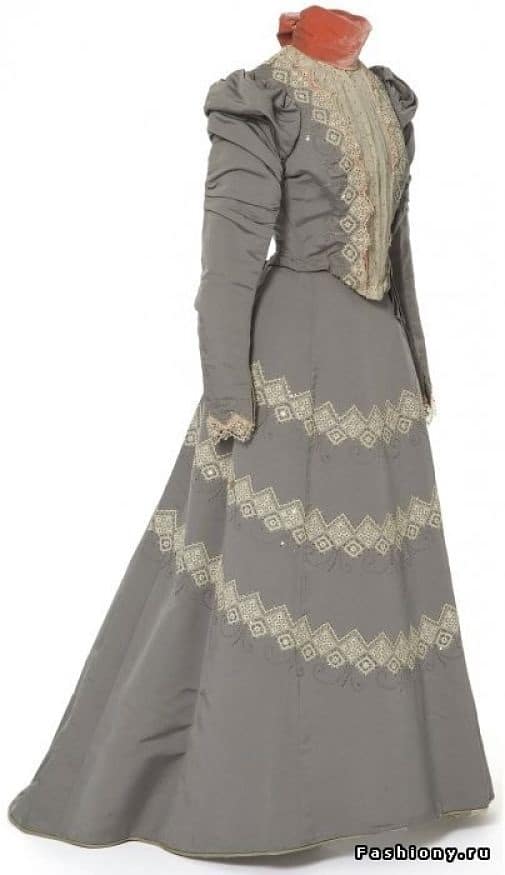 В 1870-1880 годах появились платья с турнюром — это такое приспособление в виде подушки, с помощью которого дамы делали ягодицы пышнее. В том же месте платье украшалось рюшами, драпировками, складками. Платья были украшены вышивкой, рюшами, кружевом. Пошитые из тафты, они украшались бантами, шнурочками из шелка. Под платье надевали корсет со шнуровкой. Старинные платья восьмидесятых годов символизировали богатство и благополучие.