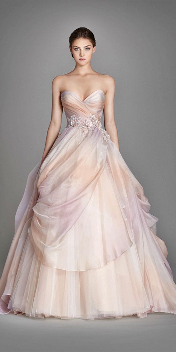 В 2018 году представлено множество вечерних платьев, некоторые очень похожи на свадебные, если к ним добавить фату и свадебный пояс у вас получится почти традиционный образ невесты. Если хочется уйти подальше от традиций, вместо пастельных оттенков выбираем более насыщенные цвета.
