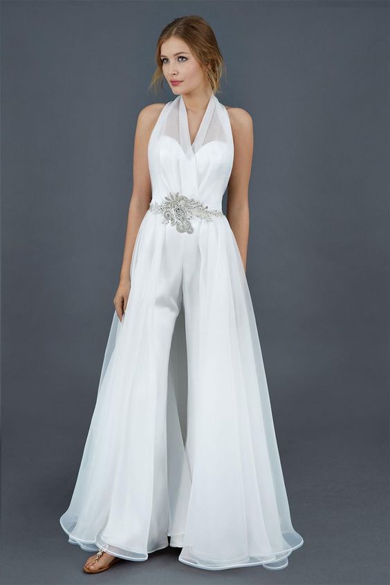 Многие девушки, примерявшие на себя свадебное платье, отмечают, что в нем совершенно неудобно двигаться, поэтому о веселье и танцах на собственной свадьбе можно забыть. Специально для них дизайнеры решили развенчать стереотип о том, что невеста должна быть в платье и создали свадебные комбинезоны и брючные наряды.