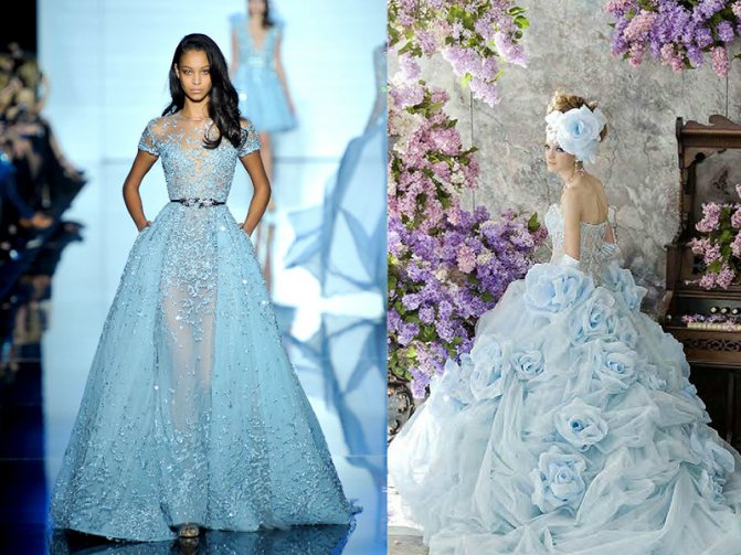 Это цвет неба, поэтому подсознательно воспринимается, как цвет чистоты и безмятежности. Образ невесты в голубом платье будет нежным и милым. Особенно уместным голубое платье будет, если свадьба назначена на весну или лето.