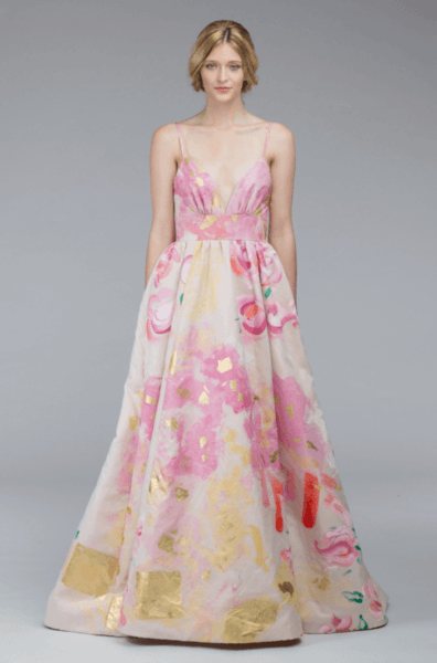 Последние коллекции дизайнеров с мировыми именами предлагают женственную и стильную новинку – модели с цветными принтами. Как правило, эксклюзивные убранства украшают цветочные композиции, а тональность их может быть абсолютно разной, от нежных акварельных рисунков до ярких узоров, покрывающих всю юбку, а иногда и лиф. Наиболее выигрышно цветные принты смотрятся на классических корсетных фасонах с объемным пышным низом.