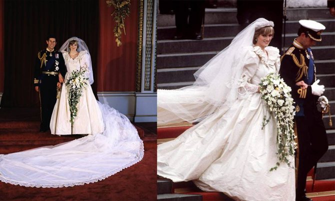 Создатели великолепного платья – Давид и Элизабет Эммануэль (Великобритания). Знаменитый подвенечный наряд цвета слоновой кости был сшит из тафты с кружевом, длина шлейфа 7,6 м, фаты – более 135 м. Для его украшения использовали бриллианты, перламутровые пайетки, более тысячи жемчужин.