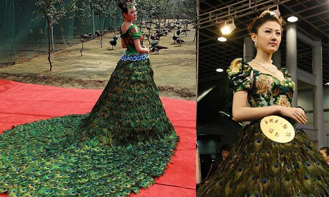 Потрясающая модель яркого изумрудного оттенка со шлейфом, длинными рукавами, выполненная с использованием более 2000 перьев павлина. Была представлена на одной из выставок моды в Китае.