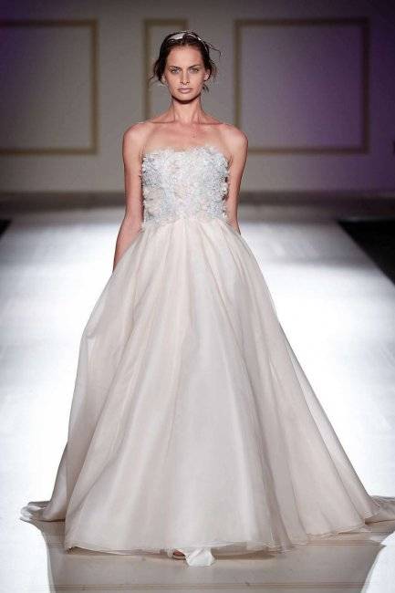 Модель, представленная на показе итальянского дизайнера в Санкт-Петербурге, является одной из сегмента очень дорогих: шелк жемчужного оттенка, изящная ручная цветочная вышивка, короткие рукава и объемная юбка.