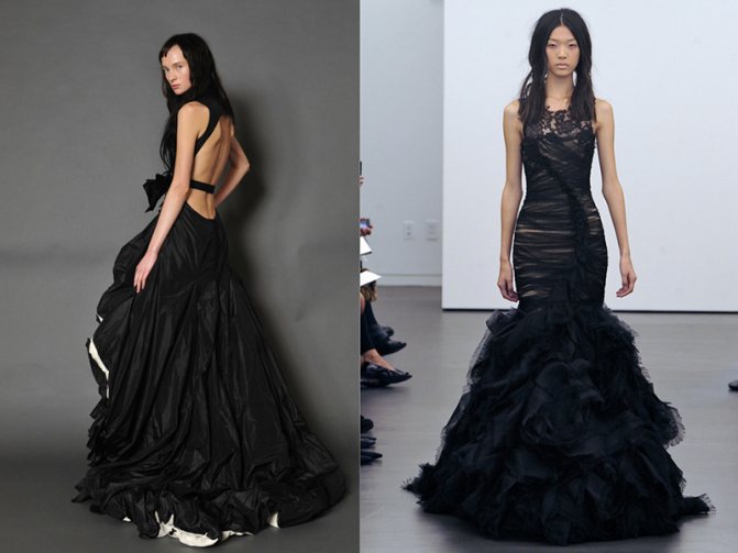 На фото видны различные вариации черных нарядов для невесты. Это тенденция нескольких лет. Споры относительно такого необычного наряда не умолкают, но одно можно сказать с уверенностью: девушка, надевшая такой вариант на свадьбу, личность смелая и самодостаточная. Несмотря на предрассудки, она готова идти против общественного мнения.