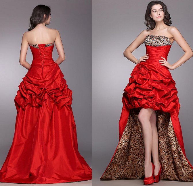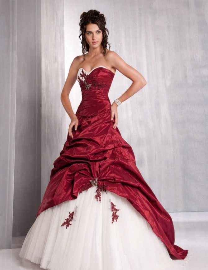 Если вы не готовы предстать перед женихом и гостями в однотонном красном платье, то выберите для торжества модели с сочетанием яркого цвета с белым. Базовый наряд может быть выполнен в белом цвете, а элементы фасона, такие как корсет, вышивка, бисер, пояс на талии, бант, декор рукавов – в красном насыщенном цвете. Контраст оттенков будет бросаться в глаза, как и сам необычный и очень красивый наряд.