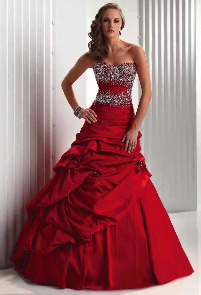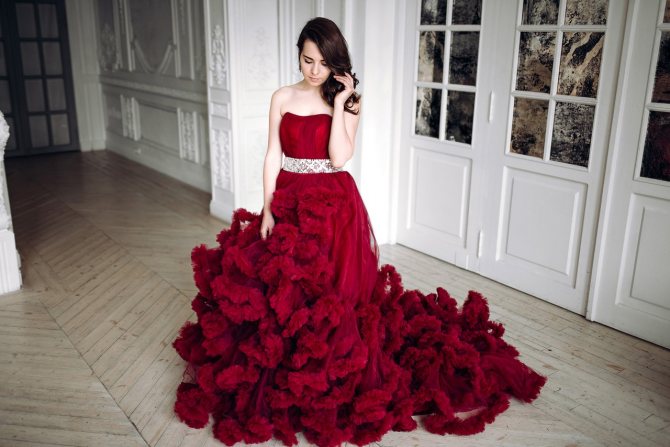 Пышные платья для свадьбы лучше выбирать не в ярких красных оттенках, а в более приглушенных, с легким вкраплением черного и серого тона.