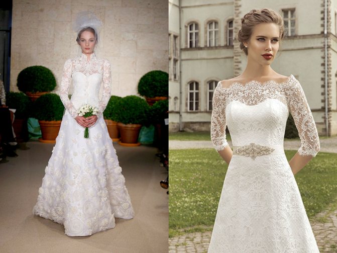 Пышная модель свадебного платья с закрытым верхом и длинными рукавами создает женственный и скромный образ. К выбору платье с длинным рукавом стоит подходить с осторожностью. Женщинам с полными руками противопоказаны облегающие кружевные рукава. А вот немолодым невестам рукава помогут скрыть возрастные изменения.