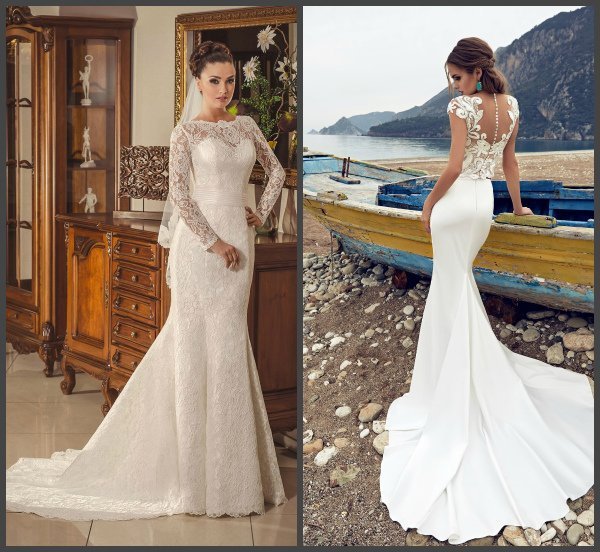 Соблазнительно выглядит платье с открытой спиной, но такой вариант подойдет только в том случае, если у невесты идеальная осанка и хорошая кожа. Красиво смотрятся и модели с кружевом. Ажурные вставки вместо провокационных вырезов на спине или груди смотрятся очень мило и скромно.