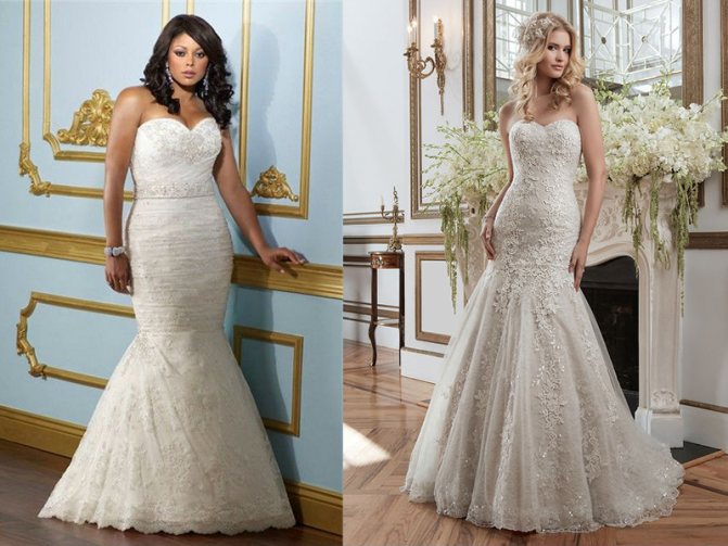 - Высоким новобрачным с пропорциональной фигурой и небольшой талией. «Рыбка» визуально делает бедра объемнее и может легко прибавить лишние килограммы, а заниженная талия – укорачивает ноги, поэтому у невысокой полной девушки нарушатся пропорции тела, и она будет казаться громоздкой; Крупным барышням подойдет данный фасон только в том случае, если у нее пропорции гармоничны, она высокая и нет животика.