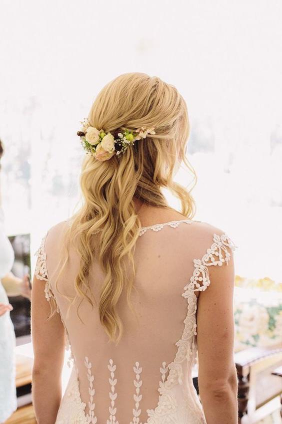 Последние годы — это актуальный тренд. С цветами в волосах невеста выглядит нежной и романтичной. Главное, чтобы они сочетались со свадебными цветами. На распущенные волосы можно даже надеть венок.
