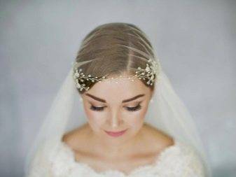 Некоторые фасоны тончайшей фаты требует гладкой «основы», поэтому для создания образа волосы необходимо выпрямить и закрепить в низкий пучок. Поверх ткани надевается металлический ободок с растительными мотивами и сверкающими камушками.