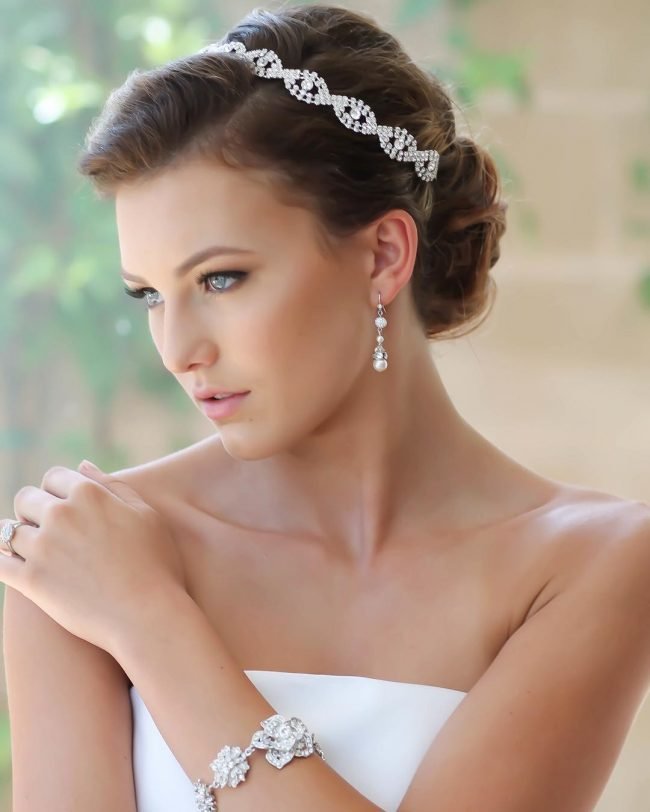 В отдельных случаях классическим обручем-диадемой или удлиненным ободком украшают основание или все «тело» пучка-плетения, находящееся сзади. Главное – следить, чтобы дорогой элемент ничем не прикрывался.
