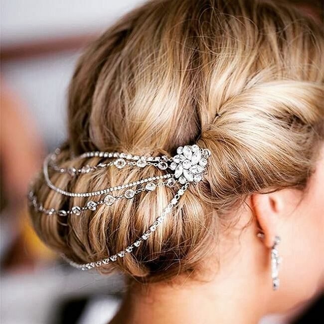Золотая тиара в волосах делает из невесты греческую богиню Идеально ровные распущенные волосы украшены потрясающим аксессуаром для волос Вторым из самых простых способов украшения прически невесты становится гребень, украшенный бусинами, который удобно воткнуть в пучок Низкие строгие узлы украшены яркими заколками