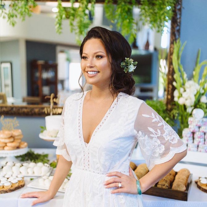 На тихое семейное торжество остановитесь на варианте с укладкой из распущенных прядок, незначительными волнами, лаконичными аксессуарами. На выездные регистрации на природе или морском берегу счастливые красотки часто останавливаются на замысловато уложенных каскадах в стиле царевны водных глубин или лесной нимфы.