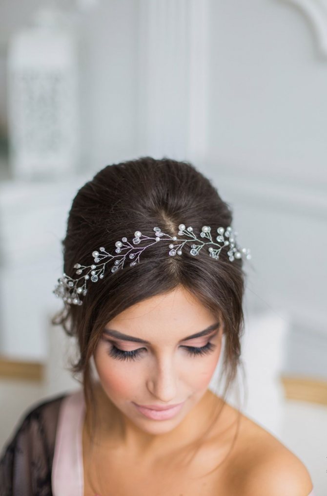 Вторым из самых простых способов украшения прически невесты становится гребень. Обычно он украшен бусинами, камнями, стразами и бисером. Он добавляет образу роскоши и эффектности. Гребешком можно дополнить любую прическу. Лучше всего смотрится на темных волосах, в данном случае значение имеет контраст. Стройнее и выше невесте помогает выглядеть классическая прическа 60-х: с валиком и гребнем. Она высокая, поэтому зрительно вытягивает лицо. Открыть лицо и придать образу романтичности можно, если гребнем заколоть локоны сзади. Простота прически очаровывает. Восхитительная диадема на распущенных накрученных волосах