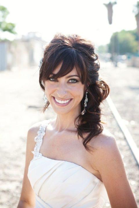 Если у невесты челка, которая ей идет, то ее не обязательно убирать в прическу. Любая свадебная прическа может быть выполнена с челкой. Однако лучше всего вписывается в любой стиль косая объемная челка, плавно перетекающая в основную копну.
