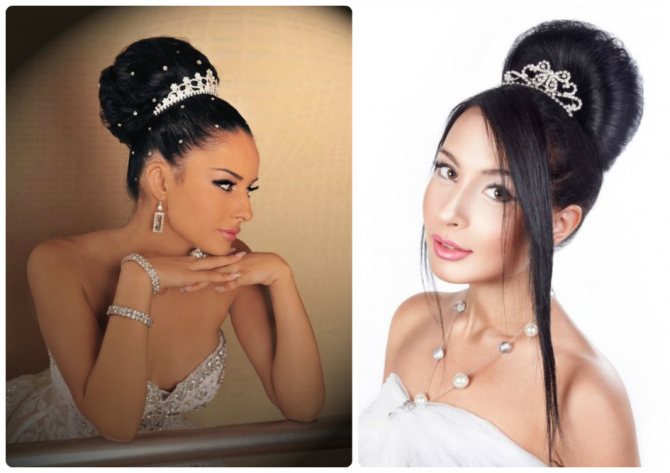 Следующим шагом приступать нужно к пучку. Так как накладные волосы уже закреплены, то нужно выбрать форму пучка: «жгут», скрученная коса, шар из начеса, «бублик». Излюбленным вариантом считается шар. В его основе лежит парикмахерские валик, который закручивается в одну из прядей всех оставшихся внизу волос. Все остальные накручиваются на валик, придавая пучку форму шара.