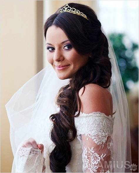 Если платье пышное, стоит подумать о более строгой плотной укладке, с использованием тех же локонов. Особую нежность и утонченность придаст тонкая диадема.