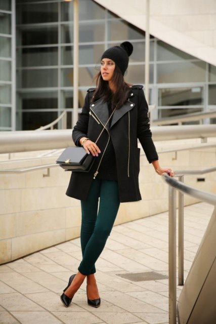 Шапка черного цвета с вуалью и помпоном составит гармоничный ансамбль с удлиненным свитером, облегающими брюками темно-зеленого оттенка, тонким пальто, небольшой сумкой и туфлями черной расцветки на высоком каблуке.