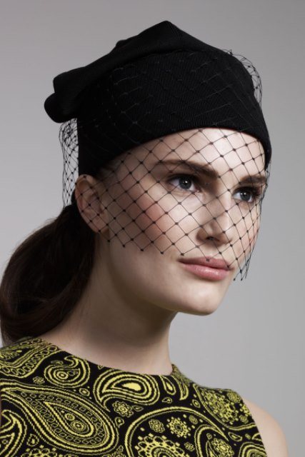 Шапка с вуалью черного цвета сочетается с платьем с восточным орнаментом. Отлично выглядит на девушках с теплым цветовым типом внешности.