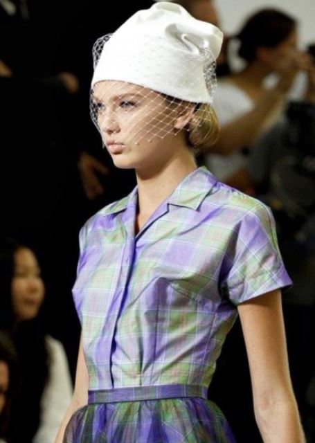 Шапка с вуалью белого цвета гармонирует с рубашкой с короткими рукавами и юбкой с клетчатым принтом. Великолепно вписывается в повседневный образ.